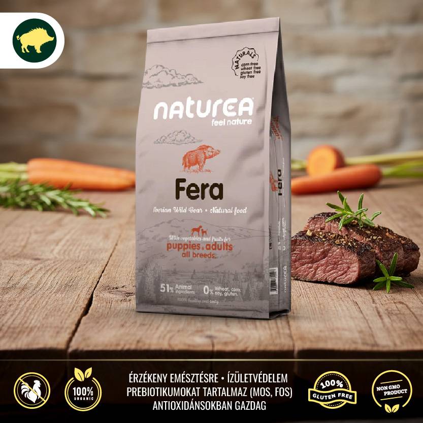 A Naturea Fera Wild Boar különleges, prémium minőségű száraztáp, amely friss vaddisznóhúsból készül – egy ritka, jól tolerálható fehérjeforrás. Ideális választás azoknak a kutyáknak, akiknél a gyakori fehérjeforrások (csirke, marha) problémát okoznak, vagy akik változatos, természetközeli étrendet igényelnek.